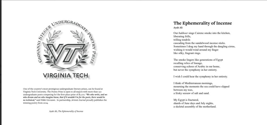winning poetry from 2024. Below is the winner of the 2024 Virginia Tech Poetry Prize, Ayah Ali with the winning poem, The Ephemerality of Incense.